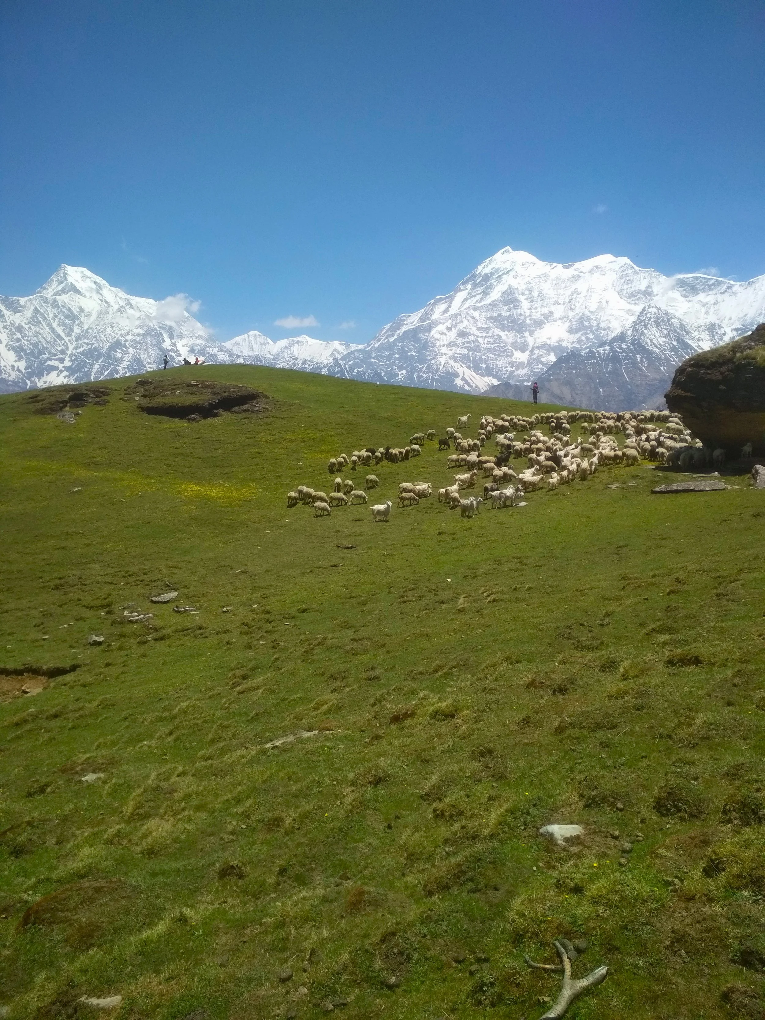 A stunning ridge walk across rolling meadows with expansive views of Trishul and Nanda Ghunti. The trail gradually climbs toward the campsite at Patar Nachauni.
